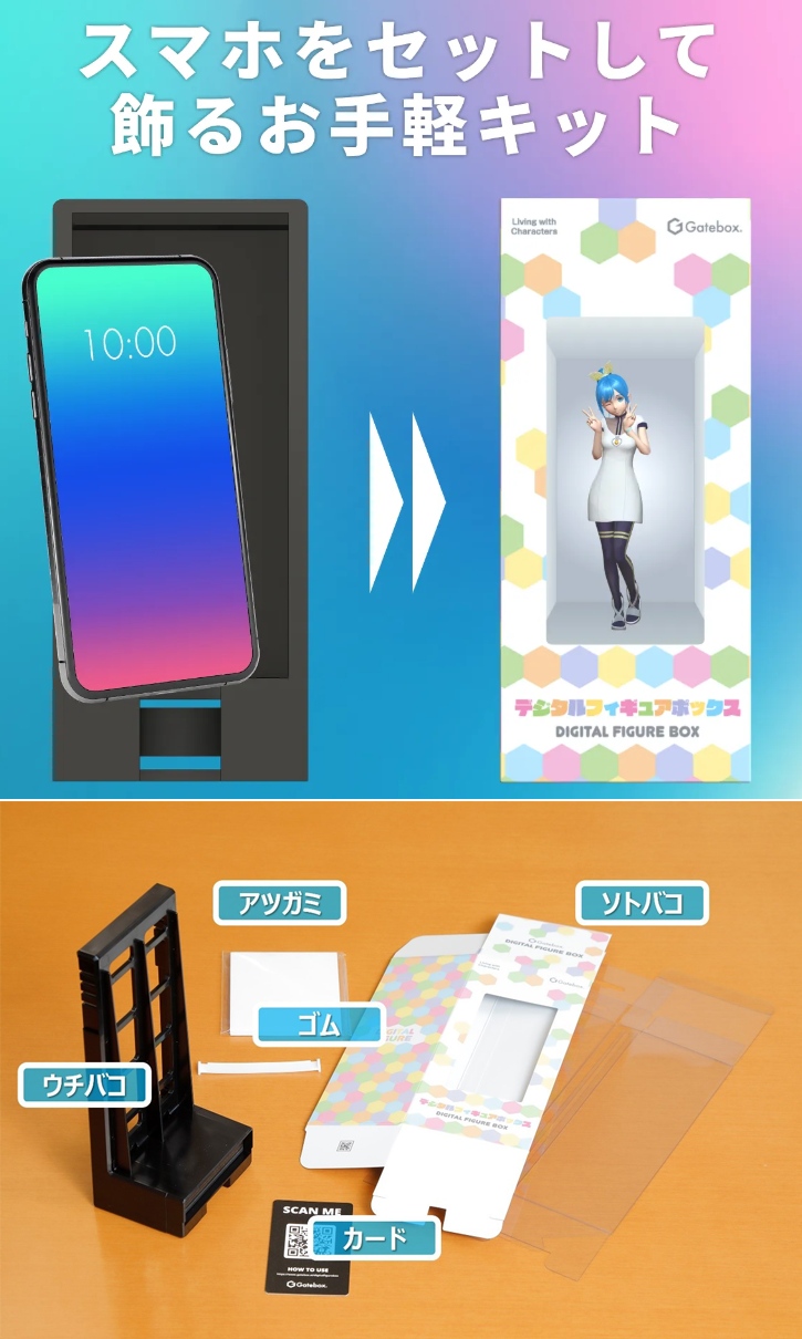 デジタルフィギュアボックスは、デジタルフィギュアをお部屋に飾るための専用ディスプレイキット。スマートフォンにお気に入りのキャラクターをダウンロードし、箱の中にスマートフォンをセットすることで、購入したお客様は実在感のあるデジタルフィギュアとの“暮らし”を実現できます。