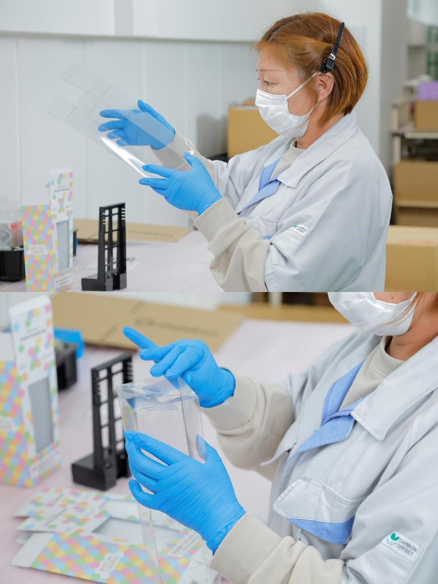組み立ては専用の作業台で行います。台の上は常に清潔に保ち、さらにシートを敷くことでキット内にゴミが混入することを防いでいます。ソトバコやクリアボックスは慎重に折り目をつけながら丁寧に箱の形を立ち上げていきます。