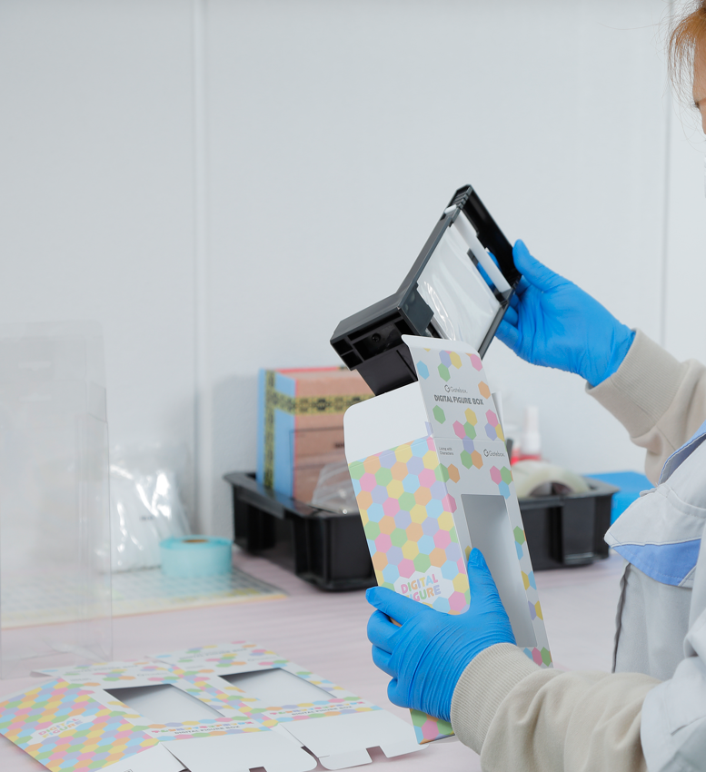 デジタルフィギュアボックスは、箱そのものが商品として重要な価値をもつため、傷や凹みはもちろんのこと、指紋の跡が残っていることも許されません。ADSはお客様のクライテリアに合わせた作業手順を設定し、案件ごとに作業マニュアル化。万全の教育体制を整えることで、繊細な作業や質の高い検品が可能。お客様の手元に届いたときの感動体験まで創造して、業務を行っています。
